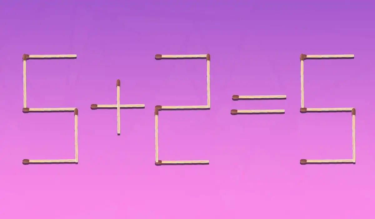 Pentru a corecta egalitatea 5+2=5, mutați chibritul vertical din stânga cifrei 5 din stânga și plasați-l oblic, transformând acel 5 într-un 3. Astfel veți obține egalitatea corectă 3+2=5.