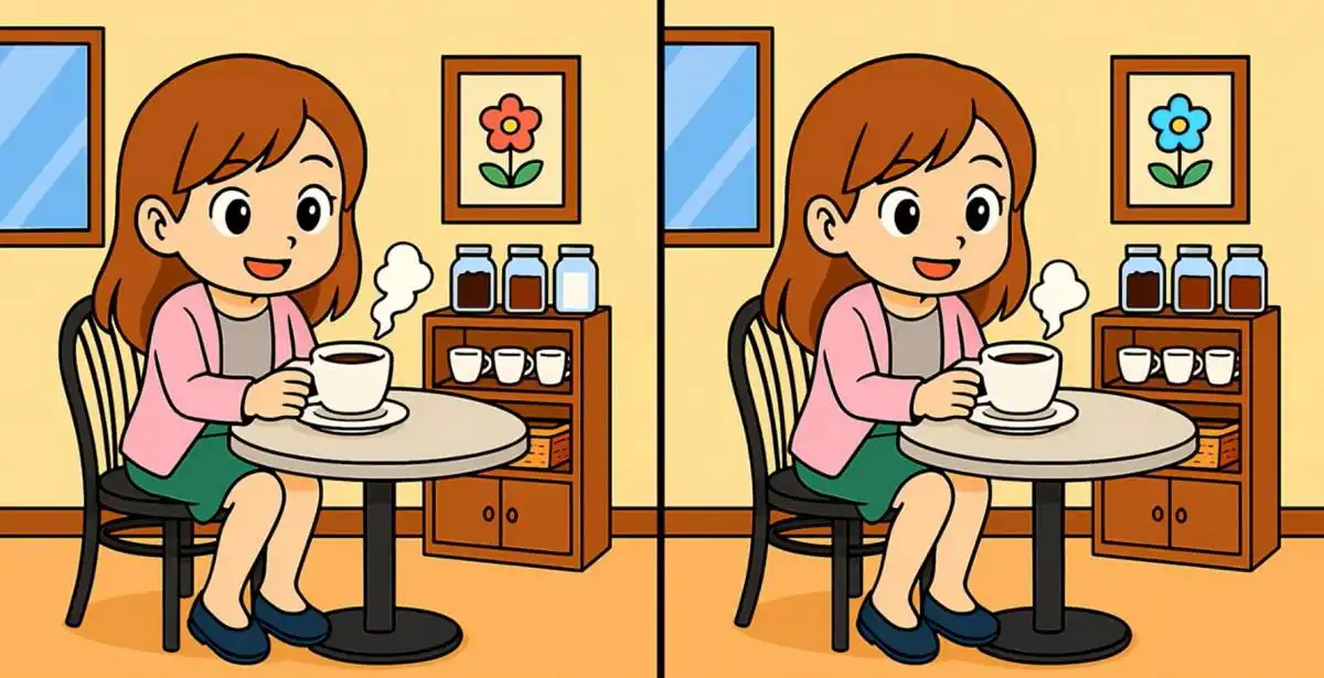 Pentru a rezolva rapid puzzle-uri de tipul „Găsește diferențele”, concentrează-vă pe zonele cheie: contururile obiectelor, culorile și texturile. În acest puzzle cu fata care bea cafea, diferențele sunt la mânecă, pălărie și modelul pe cană.