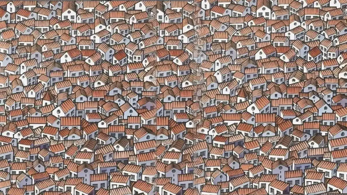 Pentru a găsi pisica ascunsă în această iluzie optică, concentrează-ți privirea pe zonele de umbră și contururile neregulate din partea dreaptă a imaginii, lângă casele cu acoperișuri ascuțite. Animalul este camuflat printre detalii arhitecturale.