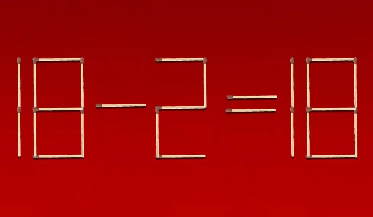 Ai o egalitate incorectă formată din chibrituri: 18-2=18. Provocarea este să o corectezi mutând un singur chibrit. Cheia este să nu te concentrezi doar pe cifre, ci și pe semnul operației matematice.
