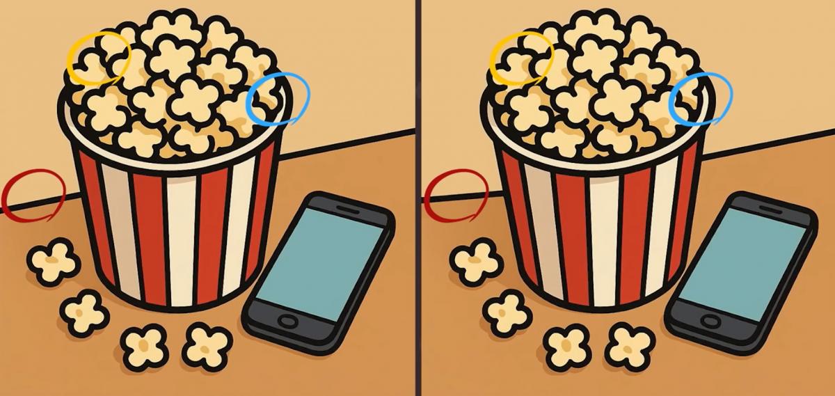 În fața ta sunt două imagini aproape identice cu o găleată de popcorn. Provocarea? Să găsești cele trei mici diferențe între ele în doar 51 de secunde. Cheia succesului stă în a scana sistematic fiecare zonă și a nu te lăsa păcălit de asemănarea generală.