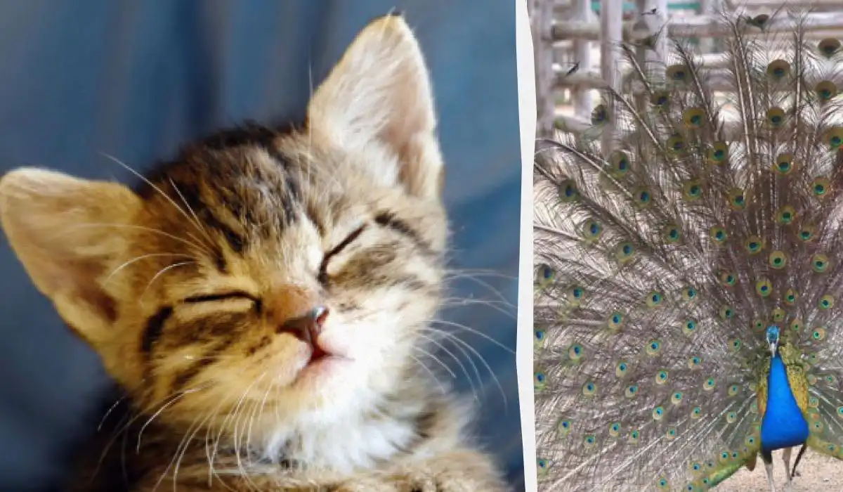 – Pisica nu este ascunsă în fundalul îndepărtat, ci este chiar lângă corpul principal al păunului.
