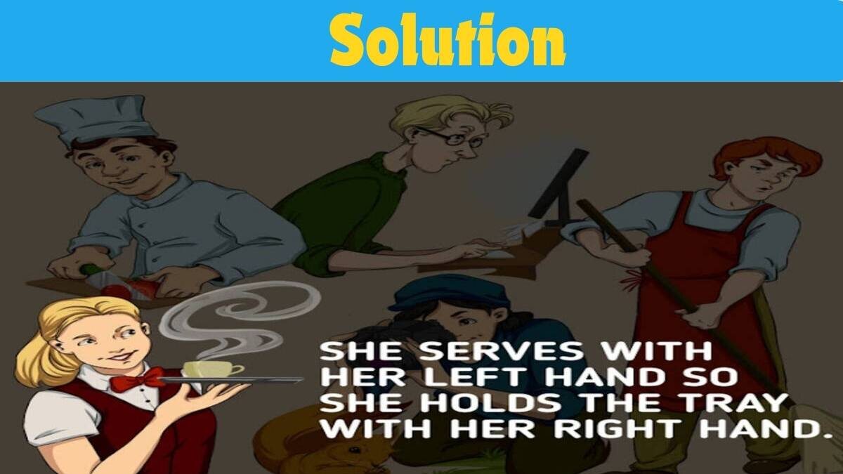 Soluția este chelnerița care ține tava. Observați că ea ține tava cu băuturile în mâna dreaptă. Pentru majoritatea oamenilor dreptaci, aceasta ar fi o poziție incomodă pentru a servi, deoarece ar trebui să întindă tava peste masă cu mâna mai puțin dominantă. Logica este că, dacă ține tava în dreapta, atunci este probabil să folosească mâna stângă pentru a plasa paharele pe masă sau pentru a efectua alte acțiuni fine de servire. Această orientare a obiectului este un indiciu puternic că ea este stângacă. Este o problemă clasică de logică și percepție a orientării.