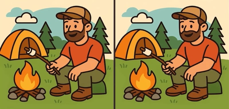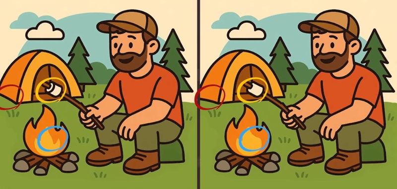 Iată o provocare clasică care îți testează abilitățile de observație. Puzzle-urile de tip „Găsește diferențele” sunt mai mult decât un joc; ele antrenează creierul să observe detalii fine și să mențină concentrarea. Imaginea de față prezintă o scenă liniștită: un bărbat stă lângă un foc, prăjind un marshmallow. Totul pare calm și identic în cele două versiuni… dar nu este. Artistul a ascuns cu pricepere trei mici discrepanțe. Ești pregătit să îți verifici viziunea și răbdarea?