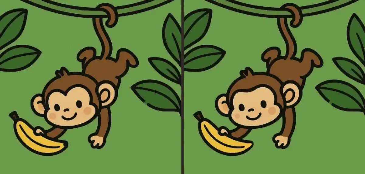 Prima diferență este la baza copacului, în colțul din stânga jos. Într-una dintre imagini, conturul unei frunze sau al unei umbre este puțin modificat, fie mai ascuțit, fie mai rotunjit. A doua diferență se află în coroana copacului, în partea dreaptă superioară. Una dintre frunze sau o grupă mică de frunze are o formă ușor diferită sau lipsește cu desăvârșire. Cea de-a treia și cea mai insidioasă diferență este pe corpul maimuței. Poate fi o pată de culoare ușor diferită pe blana sa, o modificare a conturului urechii sau a cozii. Aceste mici variații testează cu adevărat precizia observației.