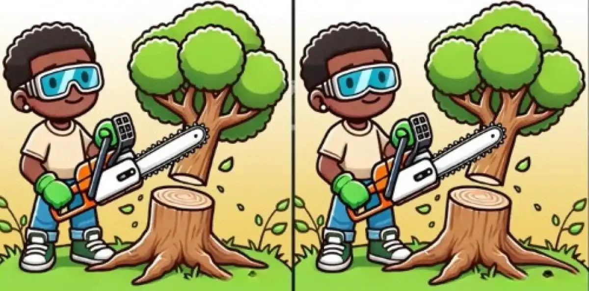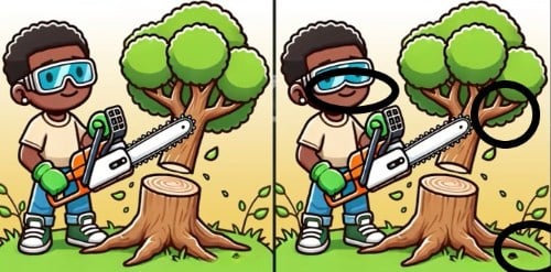 Prima diferență este la buzduganul (securea) din mâna tăietorului. În una dintre imagini, capătul metalic al buzduganului are o crestătură sau o formă ușor diferită față de cealaltă. A doua diferență se regăsește în coroana copacului din stânga. Numărul sau forma grupurilor de frunze nu este identic. A treia și cea mai vicleană diferență este o ramură mică sau un bețigaș de pe pământ, lângă baza copacului din stânga, care apare doar într-una dintre imagini. Acestea sunt cele trei discrepanțe care testează cu adevărat ochiul investigatorului.