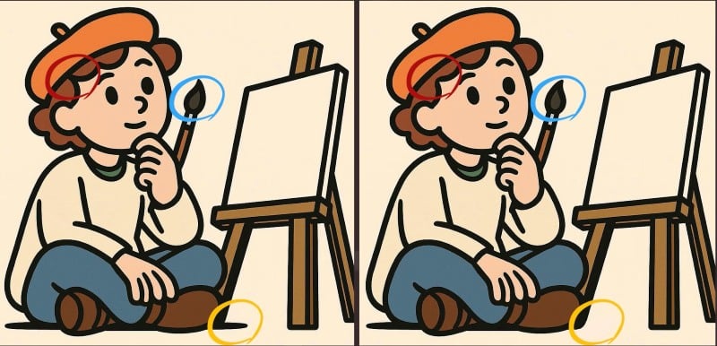 Puzzle-urile de tip „Găsește diferențele” sunt o provocare clasică pentru atenția și viteza de observație. În această sarcină, trebuie să identifici trei discrepanțe subtile între două imagini aparent identice ale unui artist la pânză, având la dispoziție doar 79 de secunde. Cheia este să scanezi sistematic fiecare zonă, de la fundal la cele mai mici detalii ale personajului.