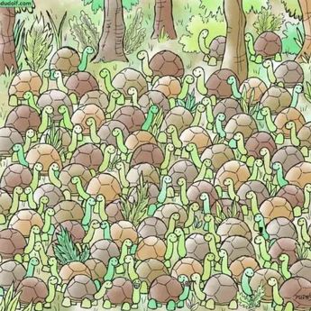 În această iluzie optică, un șarpe viclean s-a camuflat perfect printr-o mulțime de țestoase zâmbitoare. Găsește-l repede dacă poți – secretul este să cauți o formă ușor diferită și o orientare ciudată a capului.