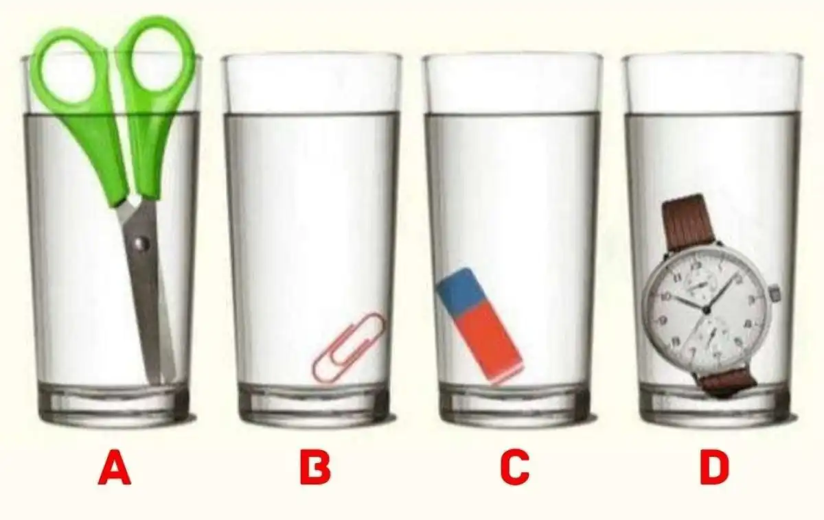 Îți place o provocare rapidă care îți verifică atenția și logica? Imaginează-ți că ești în fața unui experiment simplu: patru pahare identice, umplute până la același nivel inițial cu apă. În fiecare pahar este scufundat un obiect diferit: o foarfecă, un ac de siguranță (agrafă), un elastic și un ceas. Sarcina ta este să decizi, într-o fracțiune de secundă, care pahar conține efectiv cea mai mare cantitate de apă.