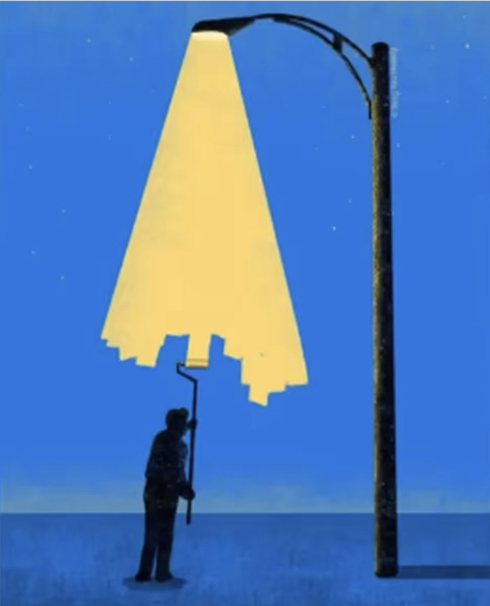 - Indiciu evident: Pentru a vedea pictorul, concentrează-te pe partea stângă a imaginii. Umbrela și felinarul sunt dominate de spațiile negre din centru și dreapta.