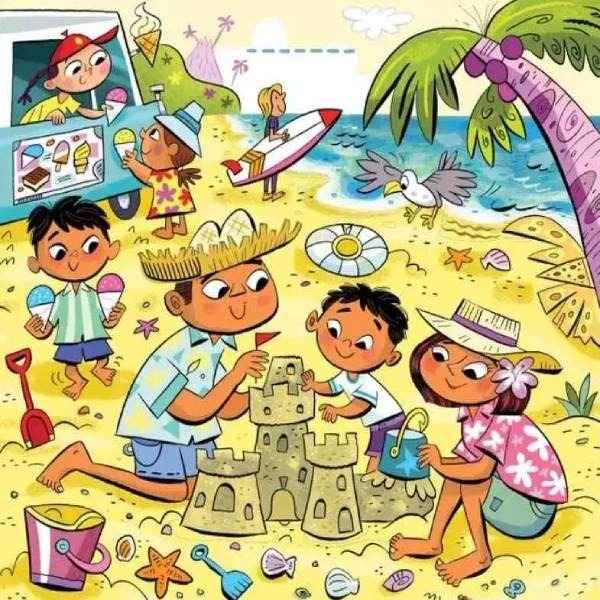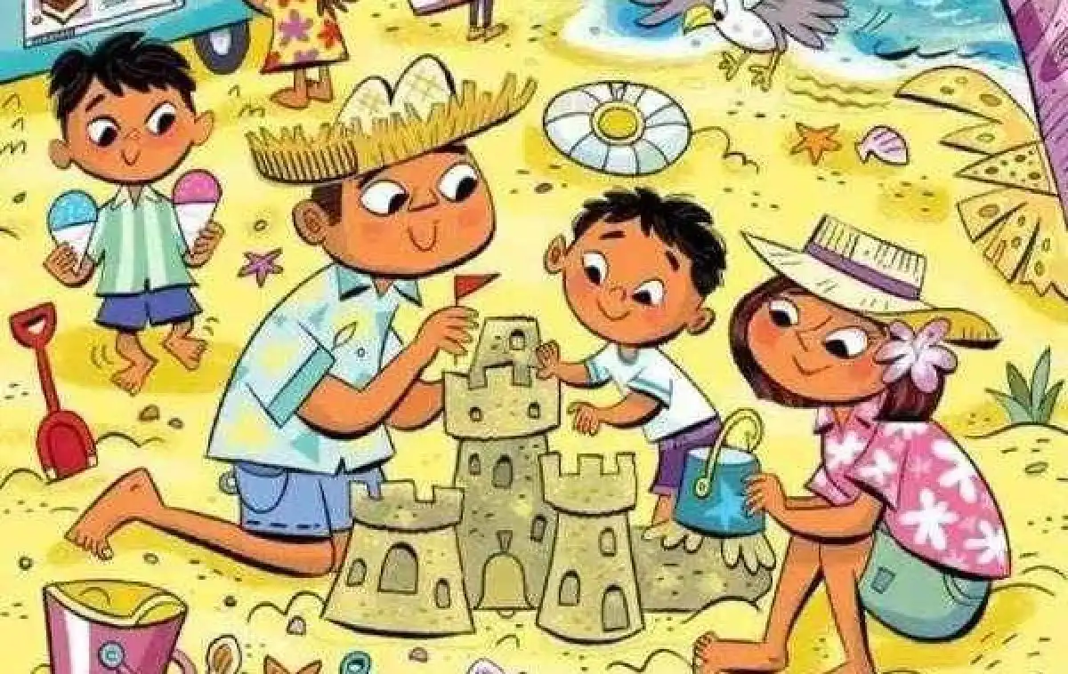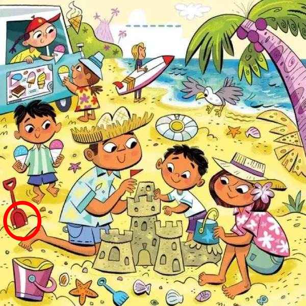 O familie se relaxează pe plajă, construind un castel de nisip, în timp ce copiii aleargă după înghețată. În toată această idilă, un obiect comun – un magnet – este ascuns cu pricepere. Cheia este să nu cauți un obiect, ci o formă sau un model care să-l imite.