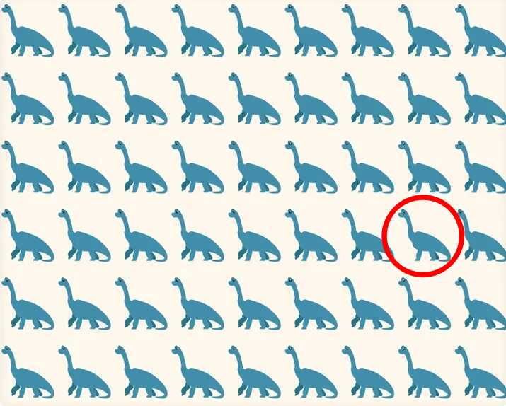 Uită-te atent la imaginea de mai jos. Toți dinozaurii sunt verzi, au ochi albi și un zâmbet. Dar unul dintre ei… este altfel.