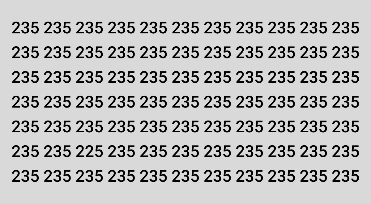Iată o provocare perfectă pentru a-ți testa agerimea mintală. Imaginează-ți că te uiți la un perete acoperit complet cu cifrele 235, aranjate ordonat. Toate par la fel, dar una dintre ele este un impostor. Sarcina ta este să localizezi acel unic număr 225, care diferă doar printr-o singură cifră. Timpul? Doar 8 secunde. Sună imposibil? Persoanele cu o observație excepțională și o viziune periferică bună au șanse.