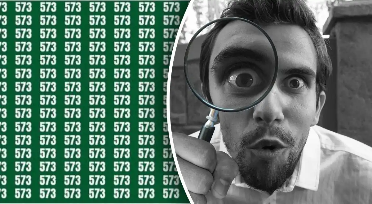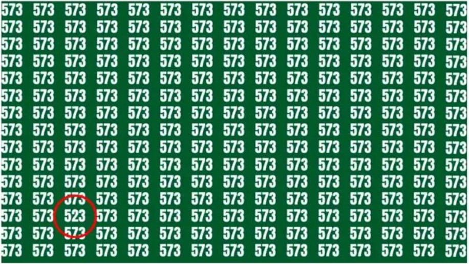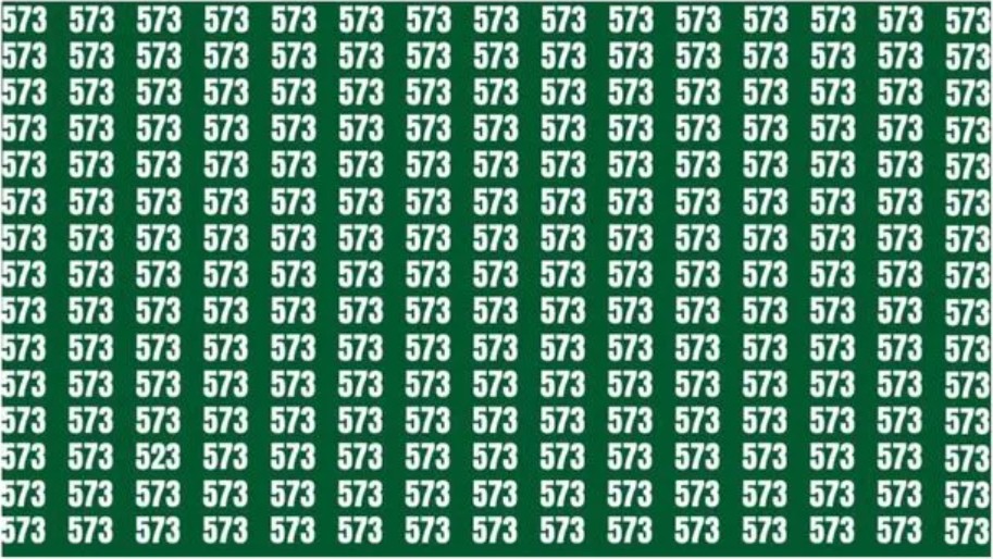 În această iluzie optică, trebuie să găsești numărul 523 ascuns într-o grilă plină cu cifra 573. Trucul este să nu te lași păcălit de eroarea de percepție și să scanezi sistematic imaginea.