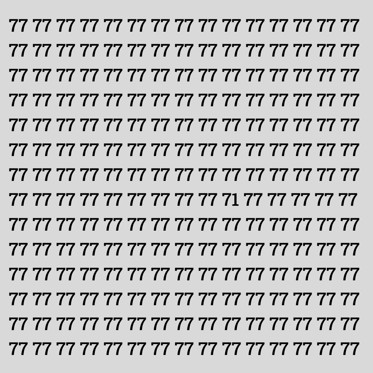Imaginează-ți că te uiți la un zid acoperit complet cu un tapet care are același model repetat la infinit. Creierul tău se obișnuiește rapid și începe să „citească” automat, să sară peste detalii. Această ghicitoare exploatează exact acest principiu. În fața ta este o matrice imensă, ordonată, formată aproape în totalitate din numărul 77. Doar unul dintre ele este de fapt 71. Sarcina ta este să-l descoperi. Sună simplu, dar iluzia optică creată de repetiție este puternică. Mulți se grăbesc și ratează soluția pentru că caută o diferență mare, în timp ce aceasta este una subtilă, localizată într-o singură cifră.