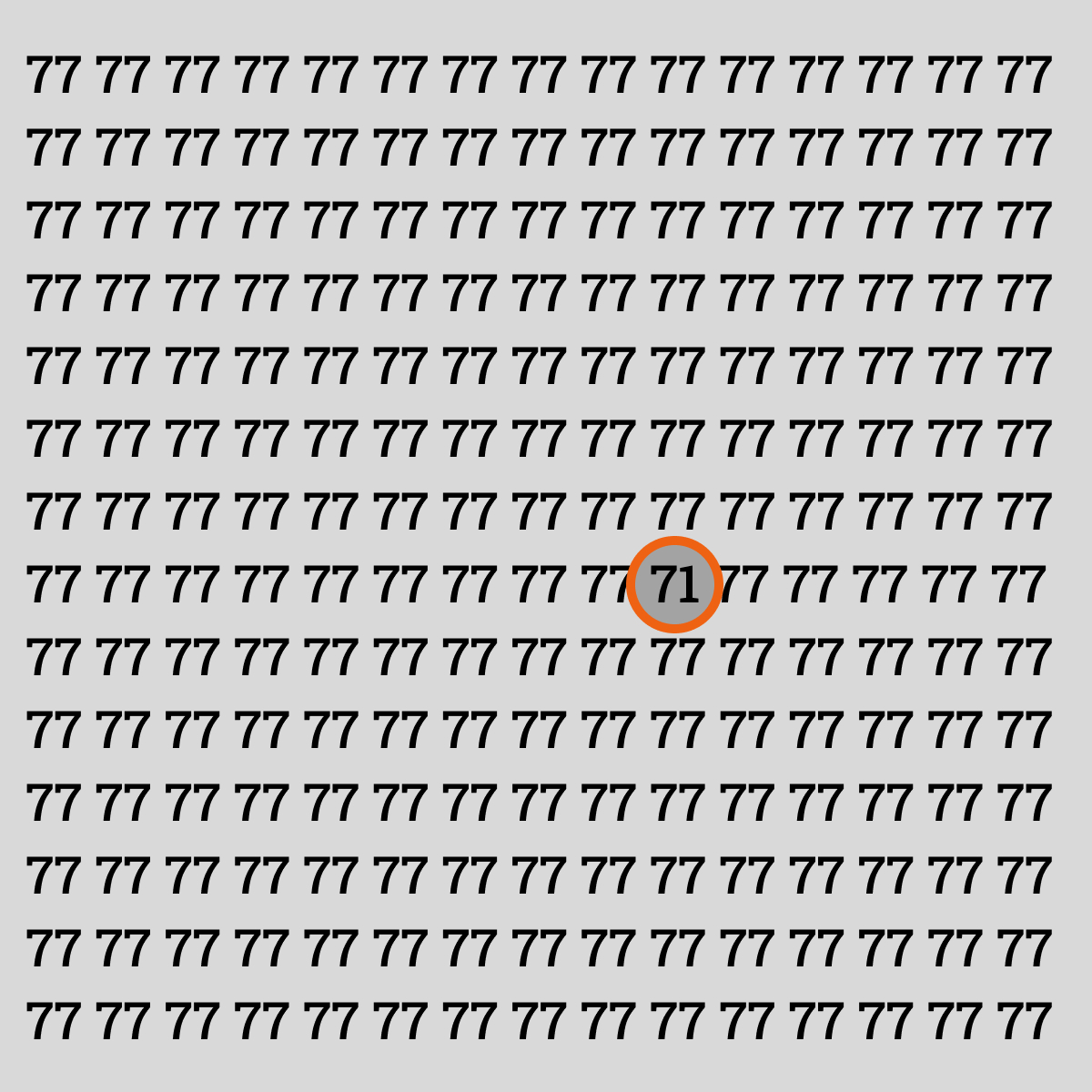 O mare de cifre identice ascunde un singur intrus – numărul 71 răspândit printre sute de 77. Găsește-l! Cheia este să-ți antrenezi atenția la detalii și să eviți eroarea percepției care te face să vezi doar modelul familiar.