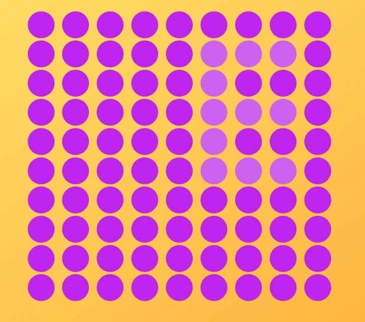 Imaginea prezintă un mozaic de cercuri de diferite nuanțe de violet, așezate ordonat pe un fundal galben. Sarcina ta este să identifici unde se formează litera E. Ai doar 6 secunde la dispoziție, ceea ce forțează creierul să treacă de la vedere pasivă la căutare activă și să se bazeze pe recunoașterea pattern-urilor.