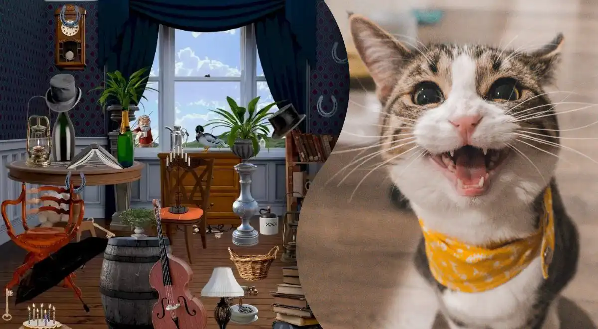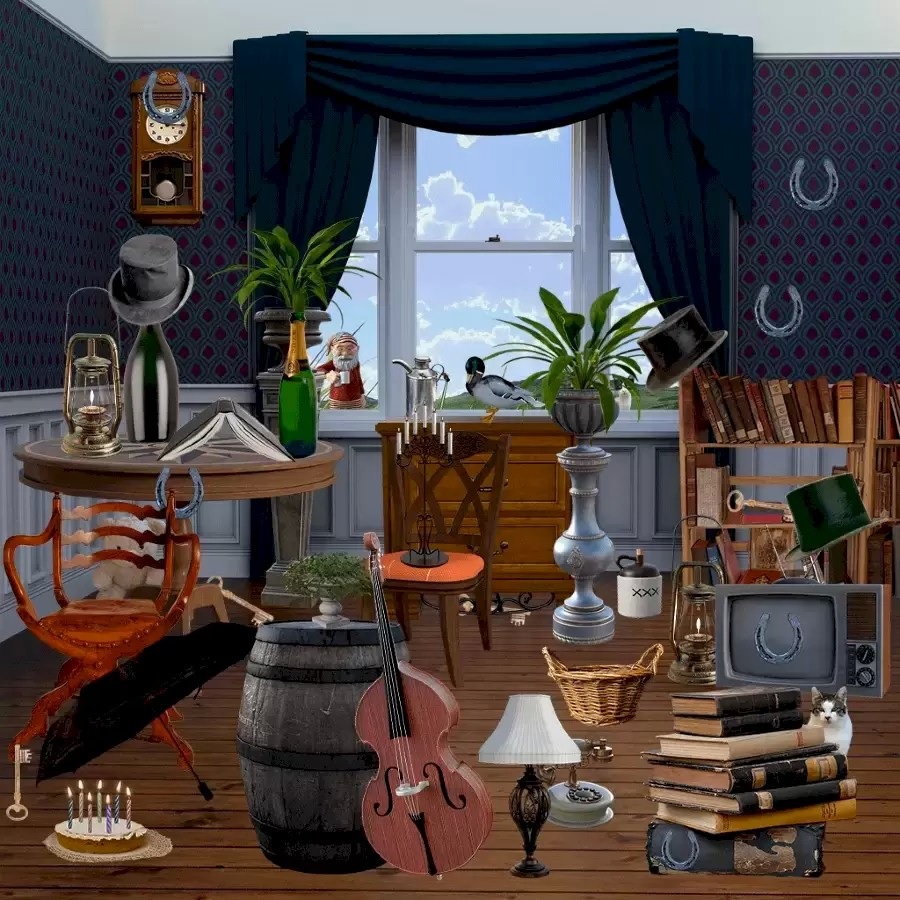 Îți plac provocările care îți testează atenția și spiritul de observație? Atunci această sarcină este perfectă pentru tine. Imaginea prezintă interiorul unei camere pline ochi. Sunt cărți împrăștiate, un tort, o vioară, un butoi și o mulțime de alte obiecte care creează un adevărat haos vizual. În mijlocul acestei dezordini deliberate, două pisici și-au găsit un loc de ascunzătoare. Sarcina ta este să le descoperi pe ambele într-un timp record. E ca o vânătoare de comori pentru ochi și minte!