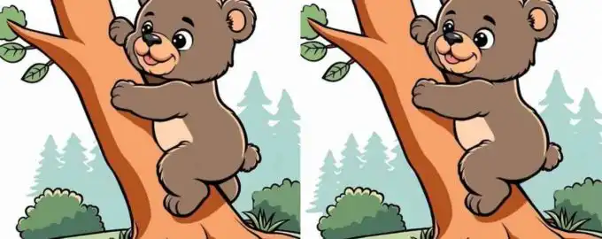 Ai ochi de șoim? Această iluzie optică te provoacă să găsești trei mici diferențe între două imagini aproape identice cu un urs drăguț cățărat într-un copac.
