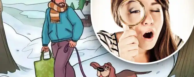 Această enigmă vizuală vă provoacă să găsiți o inconsecvență logică într-o scenă aparent normală: un bărbat se plimbă cu câinele său în zăpadă.