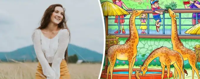 În această iluzie optică, o maimuță este ascunsă inteligent într-o scenă de grădină zoologică plină de oameni și girafe. Cheia este să cauți undeva unde