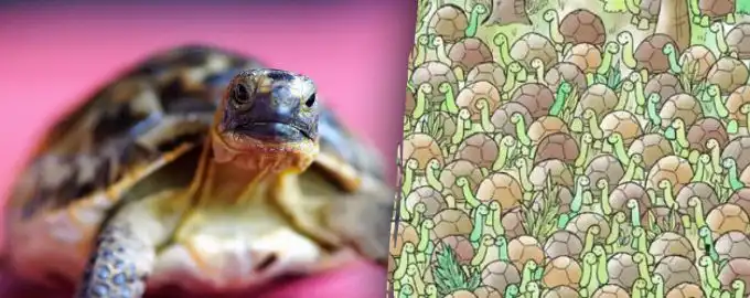 În această iluzie optică, un șarpe viclean s-a camuflat perfect printr-o mulțime de țestoase zâmbitoare. Găsește-l repede dacă poți – secretul este să