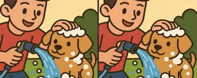 În această provocare vizuală, două imagini aproape identice cu un băiat care își îmbăiază câinele ascund trei mici diferențe. Sarcina ta este să le descoperi