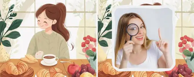 Ai doar 11 secunde pentru a găsi patru diferențe subtile între două imagini aproape identice ale unei fete care ia micul dejun. Cheia este să scanezi rapid fiecare.