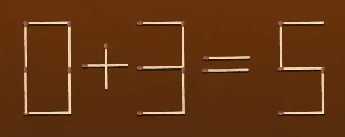 Pentru a corecta egalitatea 0+3=5 și a o face adevărată, mută un chibrit vertical de la semnul plus (+) și așează-l pe partea stângă superioară a cifrei 0.