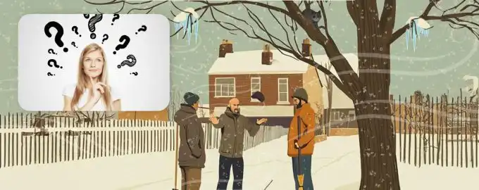Răspunsul corect este că îngrijitorul din stânga este în pericol iminent, deoarece stă nemișcat sub o mare placă de gheață care atârnă de ramura copacului și care se.