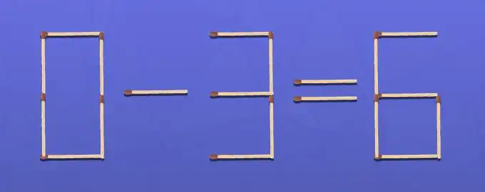 Pentru a corecta egalitatea 0-3=6 făcută din chibrituri, mutați un chibrit din cifra 0 pentru a o transforma în 9. Soluția corectă este 9-3=6.