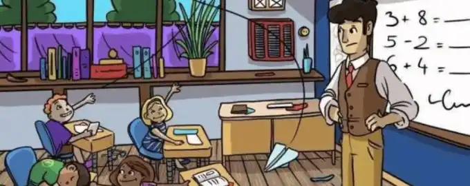 Ochelarii profesorului sunt ascunși în părul unei eleve, exact în partea stângă a imaginii, între buclele blonde. Ca profesor cu ani de experiență în clase