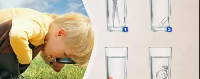 Patru pahare identice, fiecare cu un obiect diferit scufundat: foarfecă, clips, elastic și ceas. Provocarea? Să determini în 8 secunde care pahar conține